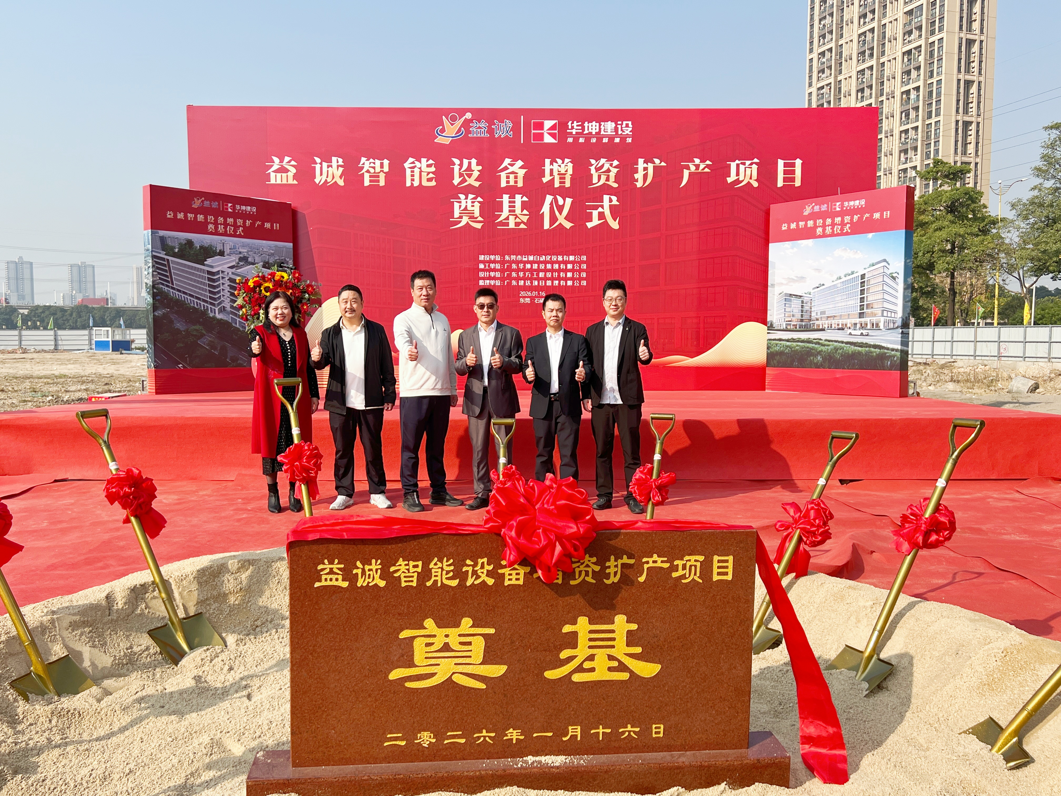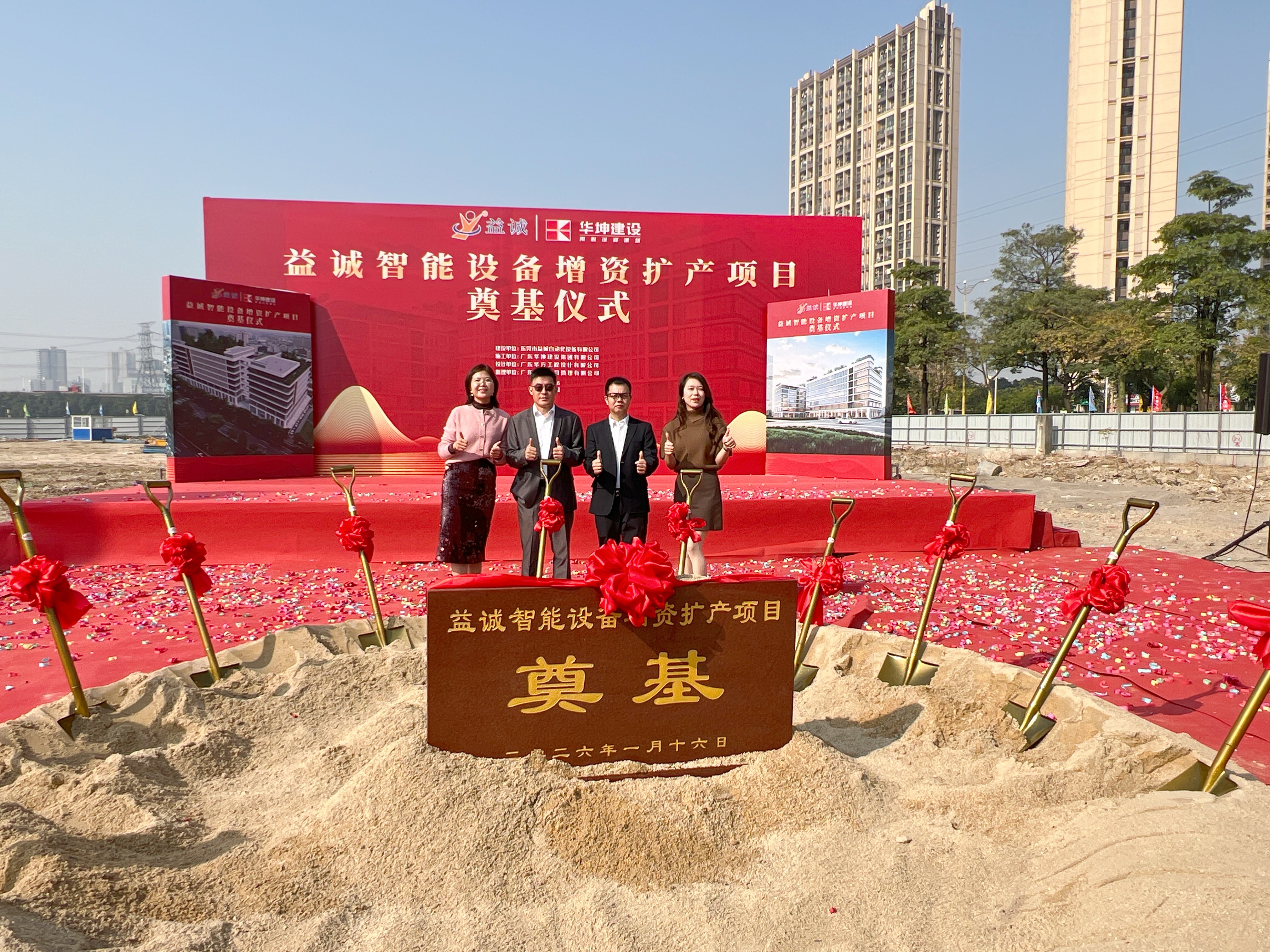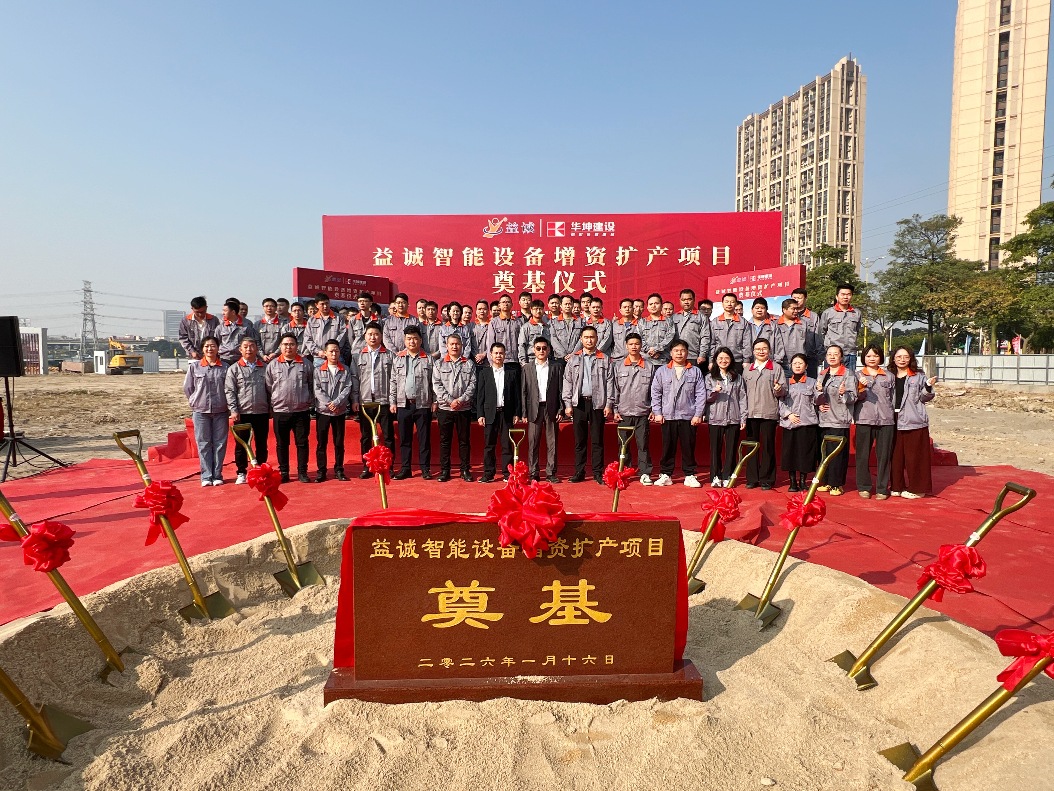 2026年1月16日,艷陽高照,晴空萬里。在這充滿希望與激情的季節(jié),益誠智能設(shè)備增資擴產(chǎn)項目奠基儀式隆重舉行。益誠自動化董事長袁董、總經(jīng)理潘總攜眾高管與本項目的設(shè)計方、施工方、監(jiān)理方等參建單位代表齊聚一堂,共同見證這一具有里程碑意義的盛典,現(xiàn)場氣氛熱烈非凡。