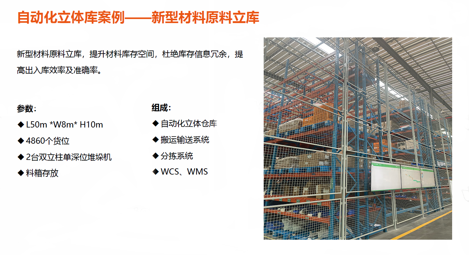 實現(xiàn)目標(biāo):提高空間利用率、便于形成先進(jìn)的物流系統(tǒng),加快貨物的存取節(jié)奏,減少庫存資金積壓